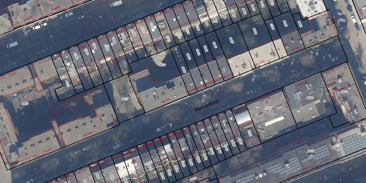 Blasiusstraat 103 is gelegen op kadastraal perceel ASD15S8616. Deze kadastrale aanduiding is uniek en wordt gebruikt door het Kadaster om eigendomsrechten en andere zakelijke rechten vast te leggen. Het perceel maakt onderdeel uit van de kadastrale gemeente Amsterdam.