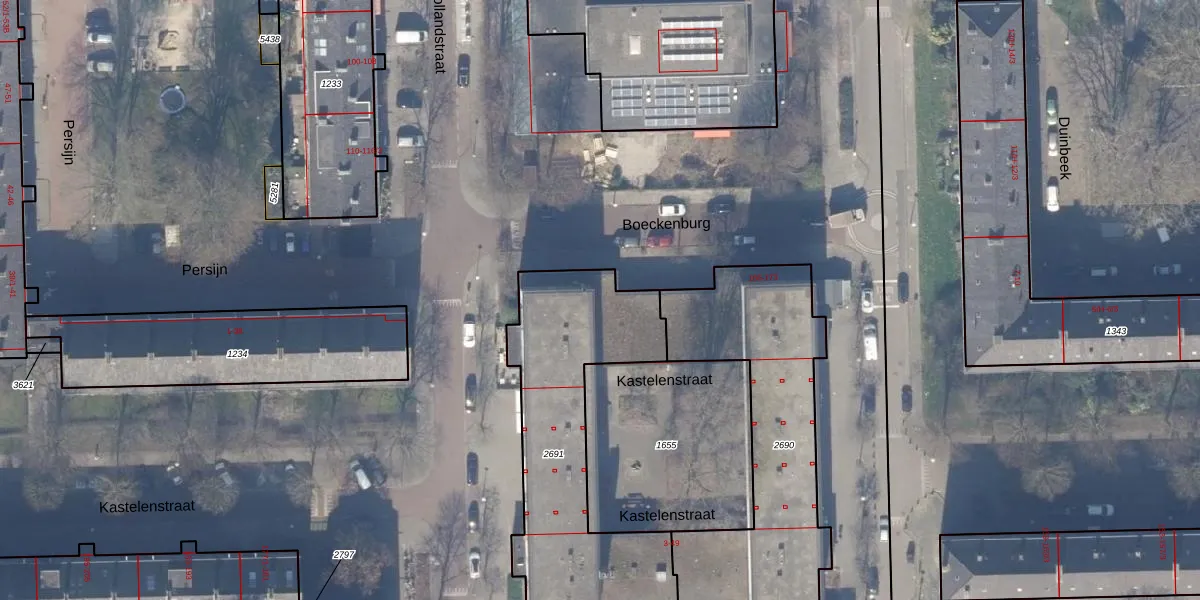 Het perceel waarop Boeckenburg 47 staat heeft een oppervlakte van 1037 m². Dit is een zeer groot perceel. De perceeloppervlakte wordt geregistreerd door het Kadaster. Gedetailleerde informatie over de maten van dit perceel kunt u vinden in het rapport Kadastrale kaart met maatvoering van Boeckenburg 47.