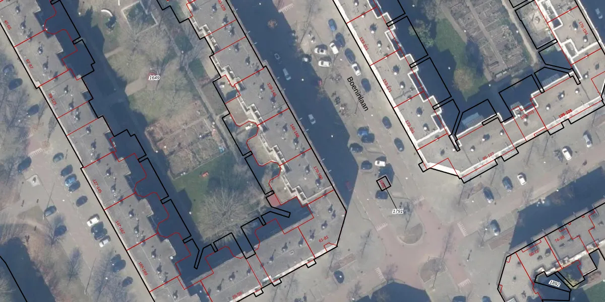 Het perceel waarop Boeninlaan 166 staat heeft een oppervlakte van 7733 m². Dit is een zeer groot perceel. De perceeloppervlakte wordt geregistreerd door het Kadaster. Gedetailleerde informatie over de maten van dit perceel kunt u vinden in het rapport Kadastrale kaart met maatvoering van Boeninlaan 166.