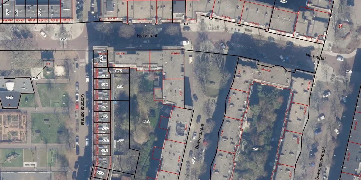 Het perceel waarop Boeroestraat 10 staat heeft een oppervlakte van 2958 m². Dit is een zeer groot perceel. De perceeloppervlakte wordt geregistreerd door het Kadaster. Gedetailleerde informatie over de maten van dit perceel kunt u vinden in het rapport Kadastrale kaart met maatvoering van Boeroestraat 10.