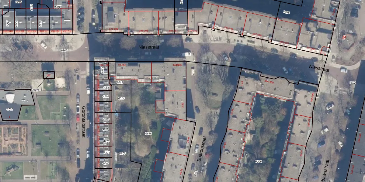 Het perceel waarop Boeroestraat 12 staat heeft een oppervlakte van 2958 m². Dit is een zeer groot perceel. De perceeloppervlakte wordt geregistreerd door het Kadaster. Gedetailleerde informatie over de maten van dit perceel kunt u vinden in het rapport Kadastrale kaart met maatvoering van Boeroestraat 12.