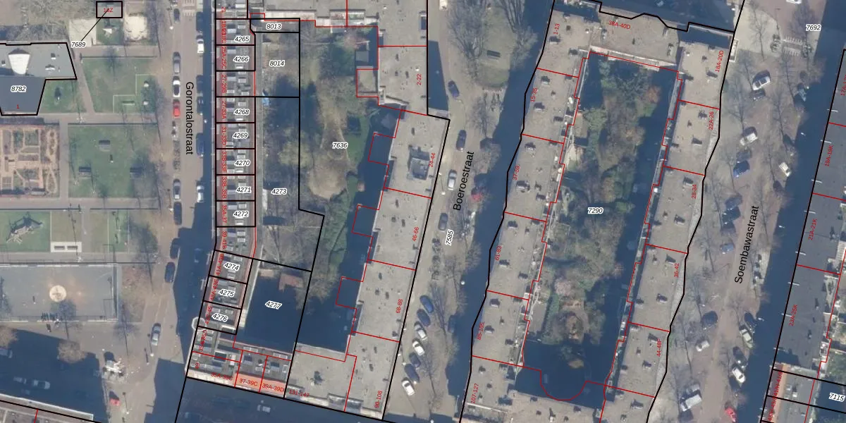 Het perceel waarop Boeroestraat 48 staat heeft een oppervlakte van 2958 m². Dit is een zeer groot perceel. De perceeloppervlakte wordt geregistreerd door het Kadaster. Gedetailleerde informatie over de maten van dit perceel kunt u vinden in het rapport Kadastrale kaart met maatvoering van Boeroestraat 48.