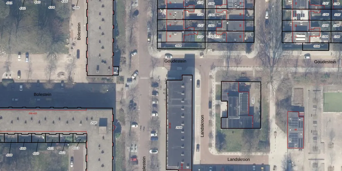 Het perceel waarop Bolestein 39 staat heeft een oppervlakte van 1550 m². Dit is een zeer groot perceel. De perceeloppervlakte wordt geregistreerd door het Kadaster. Gedetailleerde informatie over de maten van dit perceel kunt u vinden in het rapport Kadastrale kaart met maatvoering van Bolestein 39.