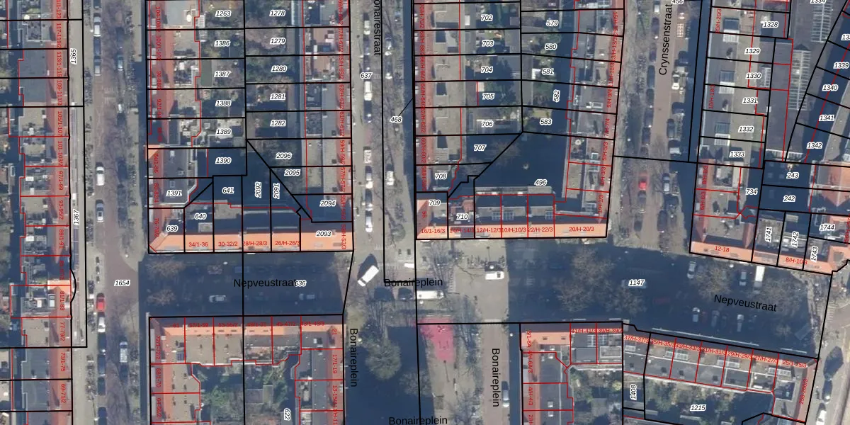 Het perceel waarop Bonairestraat 56 staat heeft een oppervlakte van 84 m². Dit is een klein perceel. De perceeloppervlakte wordt geregistreerd door het Kadaster. Gedetailleerde informatie over de maten van dit perceel kunt u vinden in het rapport Kadastrale kaart met maatvoering van Bonairestraat 56.