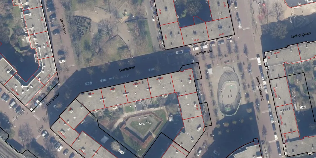 Boniplein 114 is gelegen op kadastraal perceel ASD19W7319. Deze kadastrale aanduiding is uniek en wordt gebruikt door het Kadaster om eigendomsrechten en andere zakelijke rechten vast te leggen. Het perceel maakt onderdeel uit van de kadastrale gemeente Amsterdam.