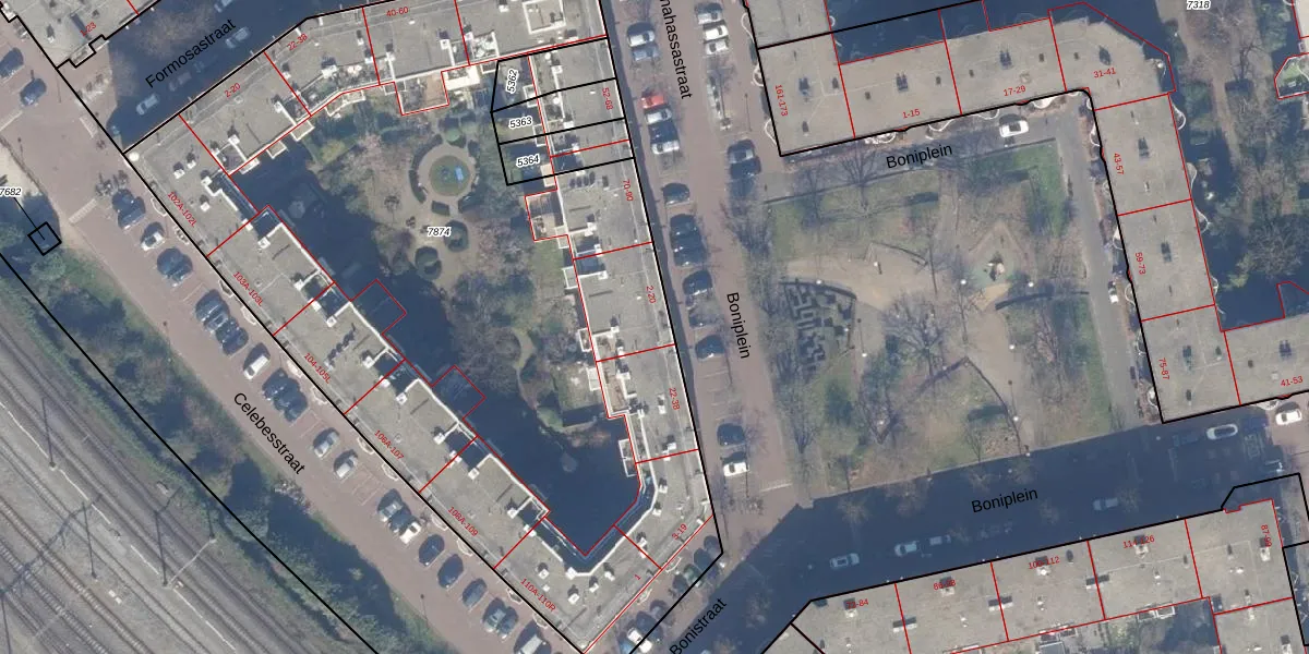 Boniplein 20 is gelegen op kadastraal perceel ASD19W7874. Deze kadastrale aanduiding is uniek en wordt gebruikt door het Kadaster om eigendomsrechten en andere zakelijke rechten vast te leggen. Het perceel maakt onderdeel uit van de kadastrale gemeente Amsterdam.