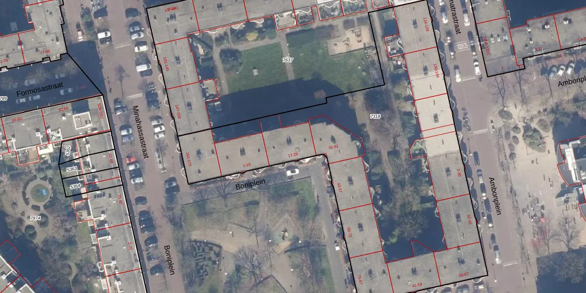 Boniplein 21 is gelegen op kadastraal perceel ASD19W7318. Deze kadastrale aanduiding is uniek en wordt gebruikt door het Kadaster om eigendomsrechten en andere zakelijke rechten vast te leggen. Het perceel maakt onderdeel uit van de kadastrale gemeente Amsterdam.