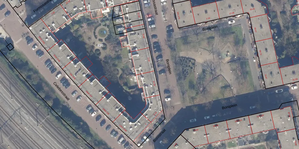 Boniplein 22 is gelegen op kadastraal perceel ASD19W7874. Deze kadastrale aanduiding is uniek en wordt gebruikt door het Kadaster om eigendomsrechten en andere zakelijke rechten vast te leggen. Het perceel maakt onderdeel uit van de kadastrale gemeente Amsterdam.