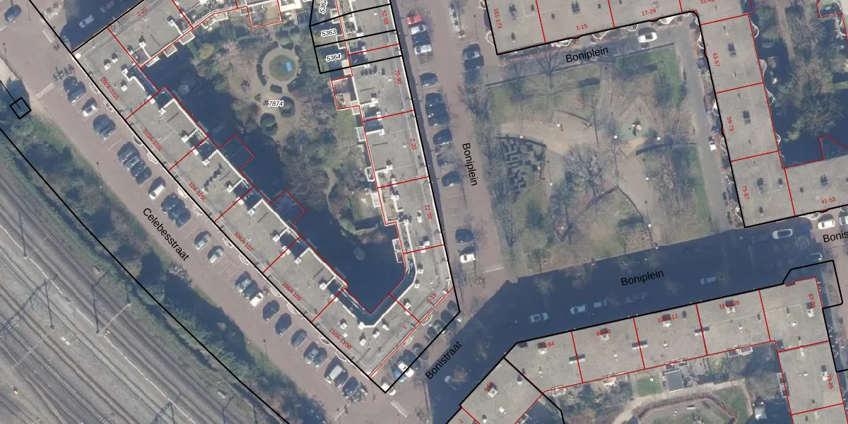 Het perceel waarop Boniplein 24 staat heeft een oppervlakte van 5099 m². Dit is een zeer groot perceel. De perceeloppervlakte wordt geregistreerd door het Kadaster. Gedetailleerde informatie over de maten van dit perceel kunt u vinden in het rapport Kadastrale kaart met maatvoering van Boniplein 24.