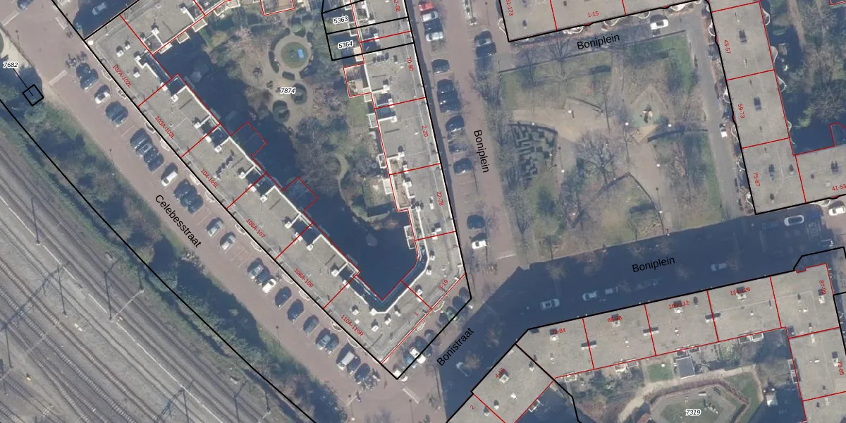 Boniplein 28 is gelegen op kadastraal perceel ASD19W7874. Deze kadastrale aanduiding is uniek en wordt gebruikt door het Kadaster om eigendomsrechten en andere zakelijke rechten vast te leggen. Het perceel maakt onderdeel uit van de kadastrale gemeente Amsterdam.