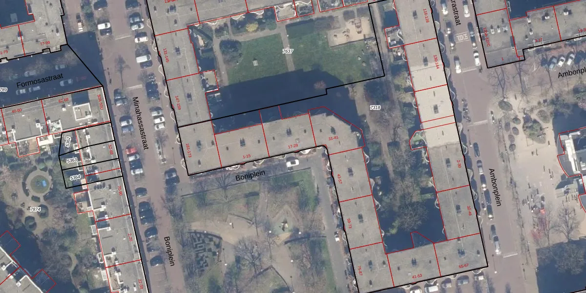Boniplein 29 is gelegen op kadastraal perceel ASD19W7318. Deze kadastrale aanduiding is uniek en wordt gebruikt door het Kadaster om eigendomsrechten en andere zakelijke rechten vast te leggen. Het perceel maakt onderdeel uit van de kadastrale gemeente Amsterdam.