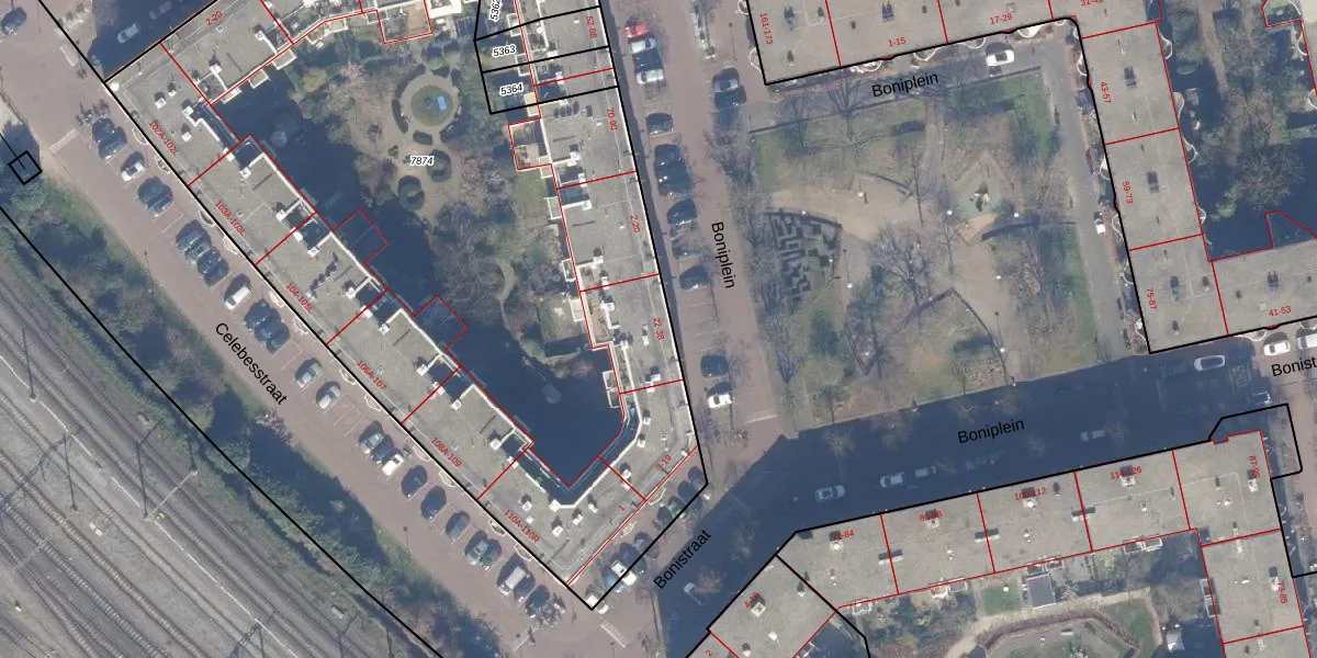 Boniplein 34 is gelegen op kadastraal perceel ASD19W7874. Deze kadastrale aanduiding is uniek en wordt gebruikt door het Kadaster om eigendomsrechten en andere zakelijke rechten vast te leggen. Het perceel maakt onderdeel uit van de kadastrale gemeente Amsterdam.