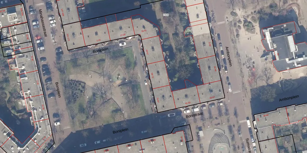 Boniplein 61 is gelegen op kadastraal perceel ASD19W7318. Deze kadastrale aanduiding is uniek en wordt gebruikt door het Kadaster om eigendomsrechten en andere zakelijke rechten vast te leggen. Het perceel maakt onderdeel uit van de kadastrale gemeente Amsterdam.