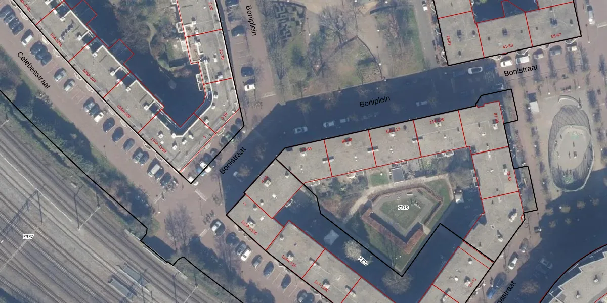 Het perceel waarop Boniplein 74 staat heeft een oppervlakte van 2955 m². Dit is een zeer groot perceel. De perceeloppervlakte wordt geregistreerd door het Kadaster. Gedetailleerde informatie over de maten van dit perceel kunt u vinden in het rapport Kadastrale kaart met maatvoering van Boniplein 74.