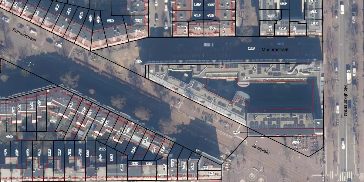 Het perceel waarop Borneostraat 39 staat heeft een oppervlakte van 2807 m². Dit is een zeer groot perceel. De perceeloppervlakte wordt geregistreerd door het Kadaster. Gedetailleerde informatie over de maten van dit perceel kunt u vinden in het rapport Kadastrale kaart met maatvoering van Borneostraat 39.