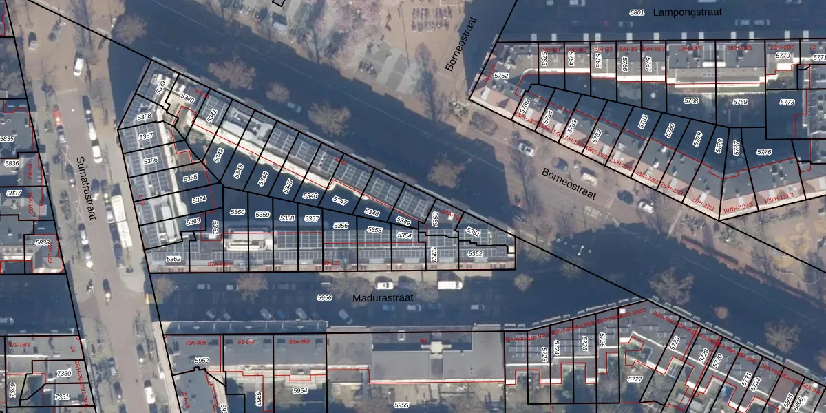 Het perceel waarop Borneostraat 68-C staat heeft een oppervlakte van 81 m². Dit is een klein perceel. De perceeloppervlakte wordt geregistreerd door het Kadaster. Gedetailleerde informatie over de maten van dit perceel kunt u vinden in het rapport Kadastrale kaart met maatvoering van Borneostraat 68-C.