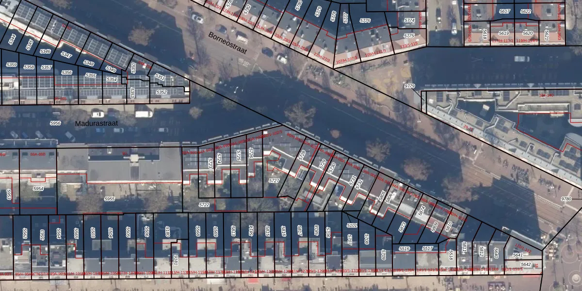Borneostraat 80-D is gelegen op kadastraal perceel ASD15S5727. Deze kadastrale aanduiding is uniek en wordt gebruikt door het Kadaster om eigendomsrechten en andere zakelijke rechten vast te leggen. Het perceel maakt onderdeel uit van de kadastrale gemeente Amsterdam.