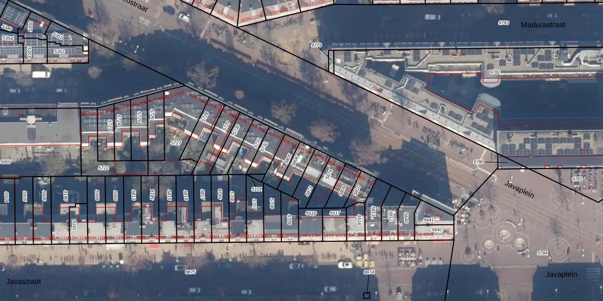 Het perceel waarop Borneostraat 94-D staat heeft een oppervlakte van 95 m². Dit is een klein perceel. De perceeloppervlakte wordt geregistreerd door het Kadaster. Gedetailleerde informatie over de maten van dit perceel kunt u vinden in het rapport Kadastrale kaart met maatvoering van Borneostraat 94-D.