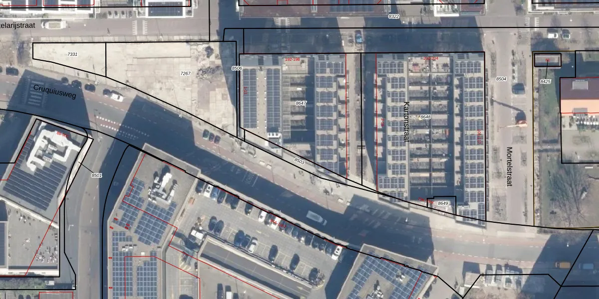 Het perceel waarop het adres ligt is ASD02-A-8647. De afkorting 'ASD02' staat voor kadastrale gemeente Amsterdam. Het perceel is 1402 m² groot. Dat is kleiner dan de gemiddelde perceeloppervlakte in Amsterdam, dat op 2763,93 m² ligt. Het kleinste perceel in de kadastrale gemeente is 0 m² groot. De grootste perceeloppervlakte is 14,3 ha. Er zijn 63 adressen aanwezig op het perceel. In de Basisregistratie Kadaster (BRK) werden de grenzen van het perceel geregistreerd op 25-06-2025.