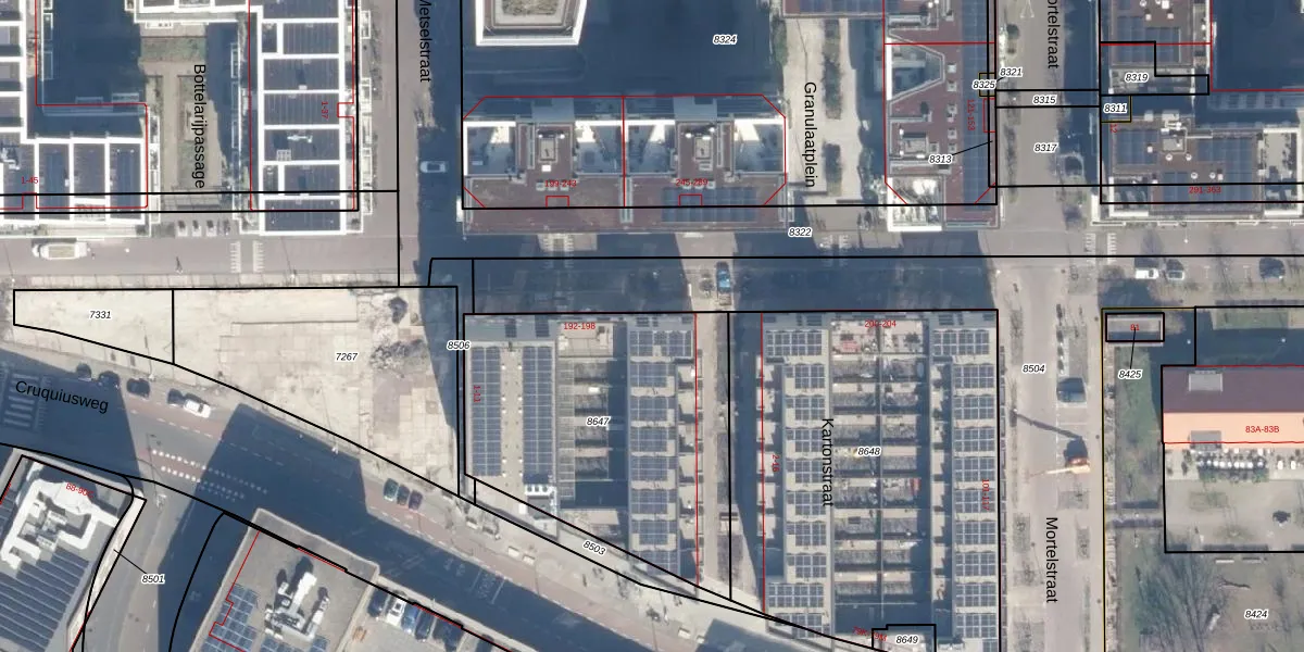 Het perceel waarop het adres ligt is ASD02-A-8647. De afkorting 'ASD02' staat voor kadastrale gemeente Amsterdam. Het perceel is 1402 m² groot. Dat is kleiner dan de gemiddelde perceeloppervlakte in Amsterdam, dat op 2763,93 m² ligt. Het kleinste perceel in de kadastrale gemeente is 0 m² groot. De grootste perceeloppervlakte is 14,3 ha. Er zijn 63 adressen aanwezig op het perceel. De laatste wijziging in het de Basisregistratie Kadaster (BRK) was op 25-06-2025.