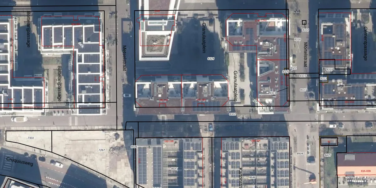 Het perceel waarop het adres ligt is ASD02-A-8324. De afkorting 'ASD02' staat voor kadastrale gemeente Amsterdam. De oppervlakte van het perceel is 4139 m². Dat is groter dan gemiddeld in Amsterdam, waar de gemiddelde perceeloppervlakte op 2763,93 m² ligt. De grootste perceeloppervlakte in de kadastrale gemeente is 14,3 ha. De kleinste oppervlakte bedraagt 0 m². Er zijn 94 adressen aanwezig op het perceel. De laatste wijziging in het de Basisregistratie Kadaster (BRK) was op 23-09-2019.