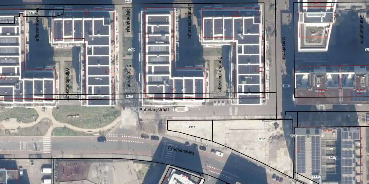 Het perceel waarop Bottelarijstraat 45 staat heeft een oppervlakte van 6995 m². Dit is een zeer groot perceel. De perceeloppervlakte wordt geregistreerd door het Kadaster. Gedetailleerde informatie over de maten van dit perceel kunt u vinden in het rapport Kadastrale kaart met maatvoering van Bottelarijstraat 45.