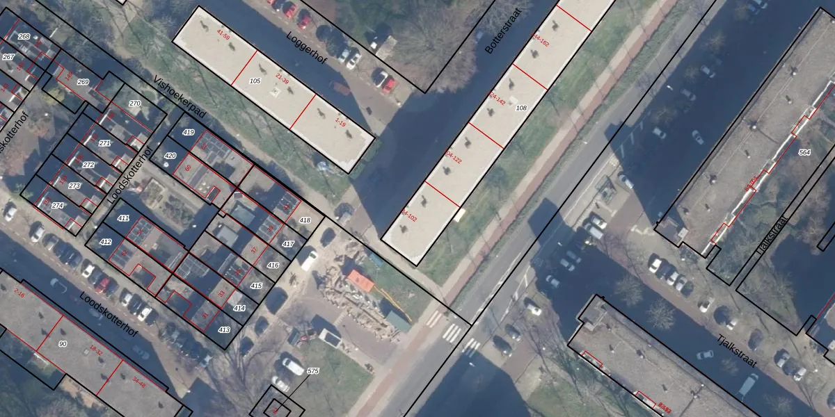Het perceel waarop Botterstraat 100 staat heeft een oppervlakte van 951 m². Dit is een groot perceel. De perceeloppervlakte wordt geregistreerd door het Kadaster. Gedetailleerde informatie over de maten van dit perceel kunt u vinden in het rapport Kadastrale kaart met maatvoering van Botterstraat 100.