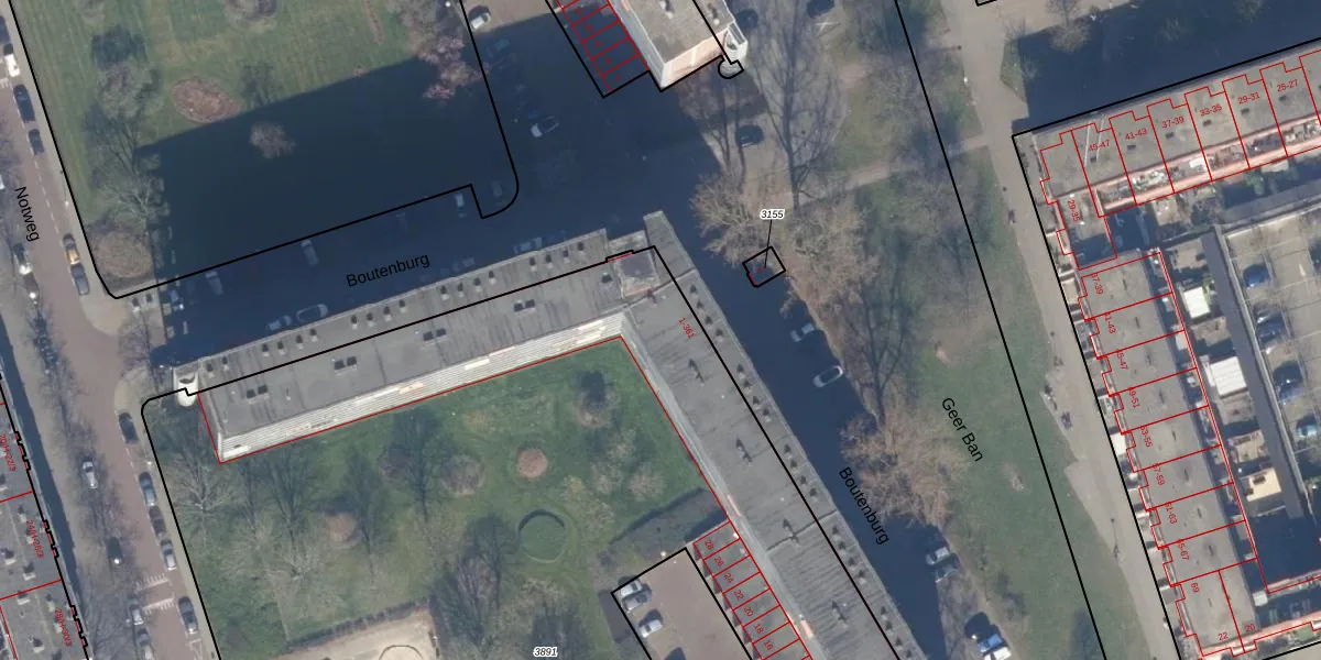 Het perceel waarop Boutenburg 107 staat heeft een oppervlakte van 7676 m². Dit is een zeer groot perceel. De perceeloppervlakte wordt geregistreerd door het Kadaster. Gedetailleerde informatie over de maten van dit perceel kunt u vinden in het rapport Kadastrale kaart met maatvoering van Boutenburg 107.