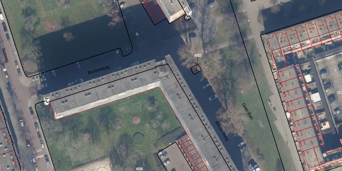 Het perceel waarop Boutenburg 121 staat heeft een oppervlakte van 7676 m². Dit is een zeer groot perceel. De perceeloppervlakte wordt geregistreerd door het Kadaster. Gedetailleerde informatie over de maten van dit perceel kunt u vinden in het rapport Kadastrale kaart met maatvoering van Boutenburg 121.