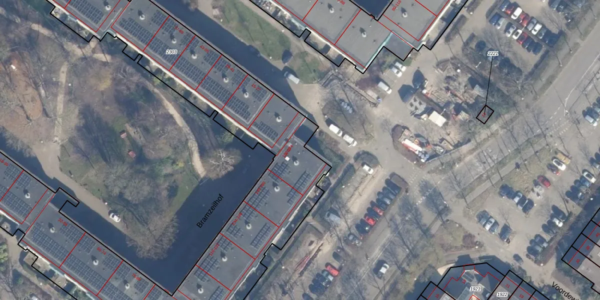 Bramzeilhof 174 is gelegen op kadastraal perceel ASD36AQ2303. Deze kadastrale aanduiding is uniek en wordt gebruikt door het Kadaster om eigendomsrechten en andere zakelijke rechten vast te leggen. Het perceel maakt onderdeel uit van de kadastrale gemeente Amsterdam.