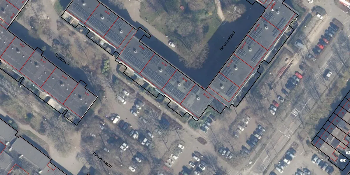 Het perceel waarop Bramzeilhof 80 staat heeft een oppervlakte van 6940 m². Dit is een zeer groot perceel. De perceeloppervlakte wordt geregistreerd door het Kadaster. Gedetailleerde informatie over de maten van dit perceel kunt u vinden in het rapport Kadastrale kaart met maatvoering van Bramzeilhof 80.