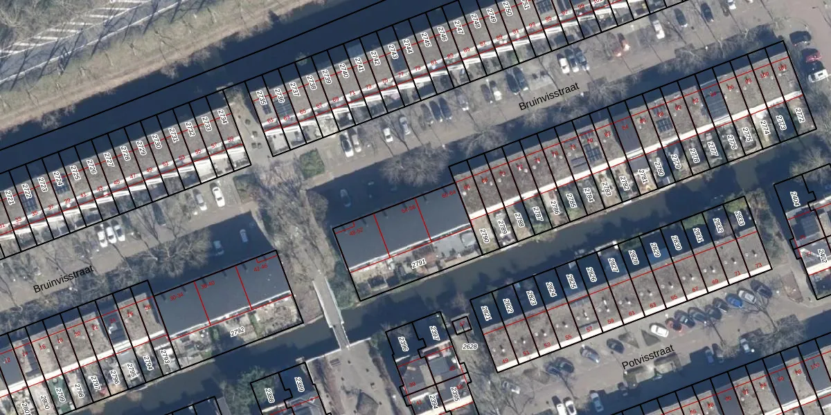Het perceel waarop Bruinvisstraat 56 staat heeft een oppervlakte van 590 m². Dit is een groot perceel. De perceeloppervlakte wordt geregistreerd door het Kadaster. Gedetailleerde informatie over de maten van dit perceel kunt u vinden in het rapport Kadastrale kaart met maatvoering van Bruinvisstraat 56.