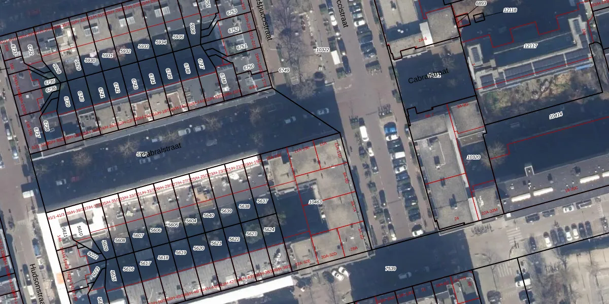 Het perceel waarop Cabralstraat 13-D staat heeft een oppervlakte van 1112 m². Dit is een zeer groot perceel. De perceeloppervlakte wordt geregistreerd door het Kadaster. Gedetailleerde informatie over de maten van dit perceel kunt u vinden in het rapport Kadastrale kaart met maatvoering van Cabralstraat 13-D.