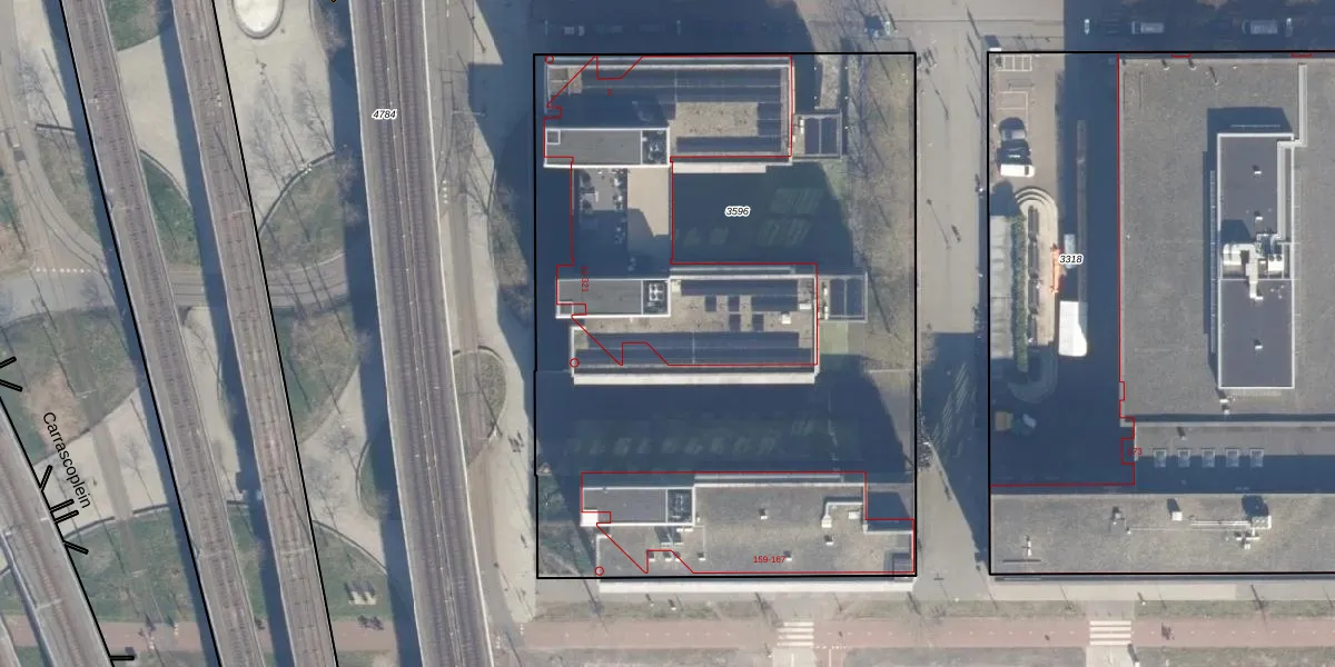 Het perceel waarop Carrascoplein 301 staat heeft een oppervlakte van 4460 m². Dit is een zeer groot perceel. De perceeloppervlakte wordt geregistreerd door het Kadaster. Gedetailleerde informatie over de maten van dit perceel kunt u vinden in het rapport Kadastrale kaart met maatvoering van Carrascoplein 301.