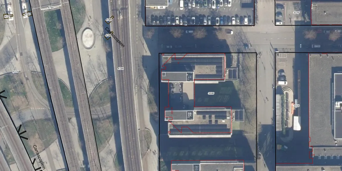 Het perceel waarop Carrascoplein 61 staat heeft een oppervlakte van 4460 m². Dit is een zeer groot perceel. De perceeloppervlakte wordt geregistreerd door het Kadaster. Gedetailleerde informatie over de maten van dit perceel kunt u vinden in het rapport Kadastrale kaart met maatvoering van Carrascoplein 61.