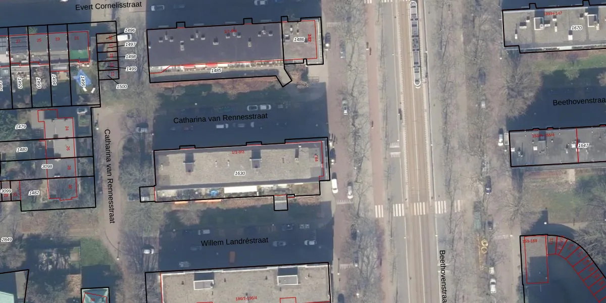 Het perceel waarop Catharina van Rennesstraat 1-3 staat heeft een oppervlakte van 1047 m². Dit is een zeer groot perceel. De perceeloppervlakte wordt geregistreerd door het Kadaster. Gedetailleerde informatie over de maten van dit perceel kunt u vinden in het rapport Kadastrale kaart met maatvoering van Catharina van Rennesstraat 1-3.