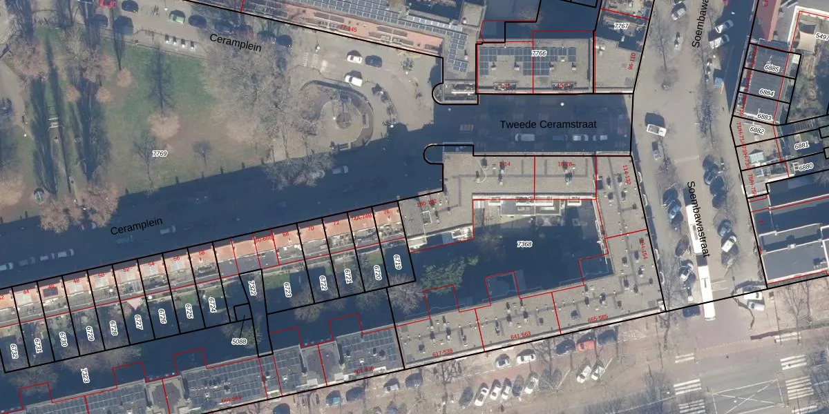 Het perceel waarop Ceramplein 184 staat heeft een oppervlakte van 2639 m². Dit is een zeer groot perceel. De perceeloppervlakte wordt geregistreerd door het Kadaster. Gedetailleerde informatie over de maten van dit perceel kunt u vinden in het rapport Kadastrale kaart met maatvoering van Ceramplein 184.