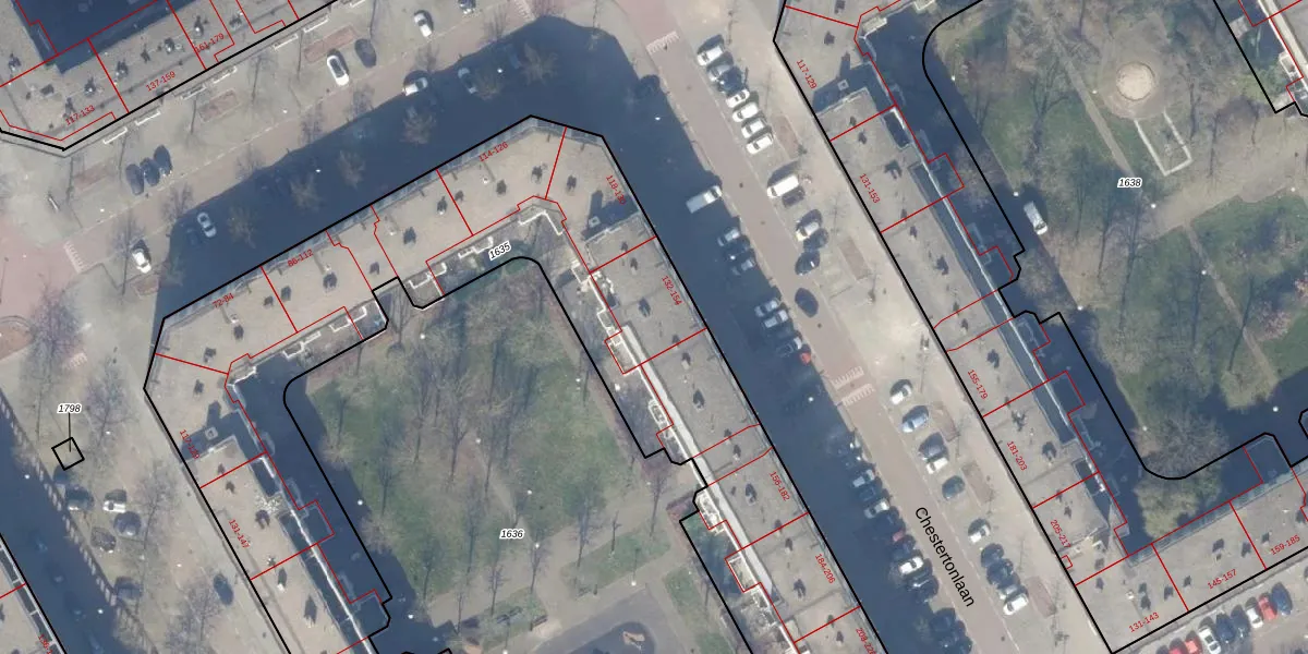 Chestertonlaan 154 is gelegen op kadastraal perceel WPK02A1635. Deze kadastrale aanduiding is uniek en wordt gebruikt door het Kadaster om eigendomsrechten en andere zakelijke rechten vast te leggen. Het perceel maakt onderdeel uit van de kadastrale gemeente Weesperkarspel.