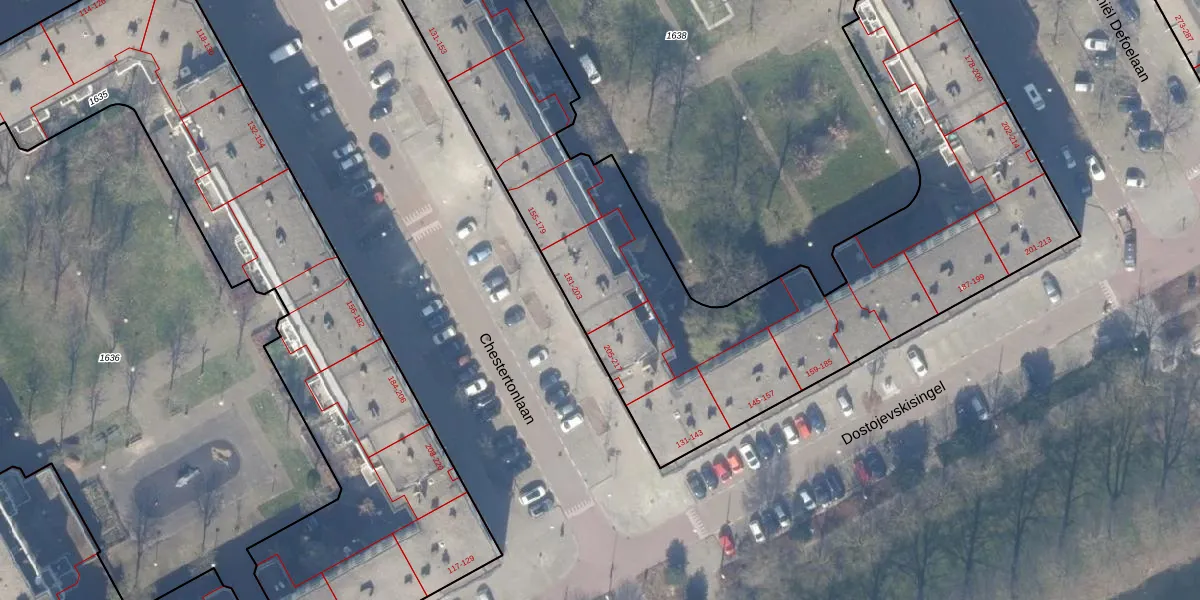 Chestertonlaan 201 is gelegen op kadastraal perceel WPK02A1637. Deze kadastrale aanduiding is uniek en wordt gebruikt door het Kadaster om eigendomsrechten en andere zakelijke rechten vast te leggen. Het perceel maakt onderdeel uit van de kadastrale gemeente Weesperkarspel.