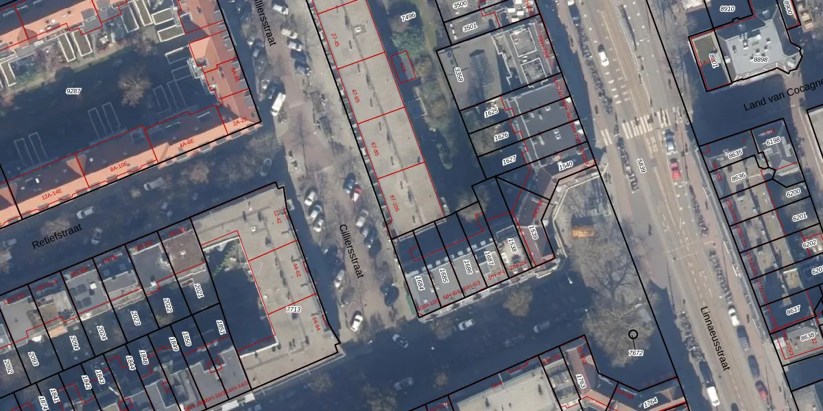 Cilliersstraat 103 is gelegen op kadastraal perceel ASD19W7496. Deze kadastrale aanduiding is uniek en wordt gebruikt door het Kadaster om eigendomsrechten en andere zakelijke rechten vast te leggen. Het perceel maakt onderdeel uit van de kadastrale gemeente Amsterdam.