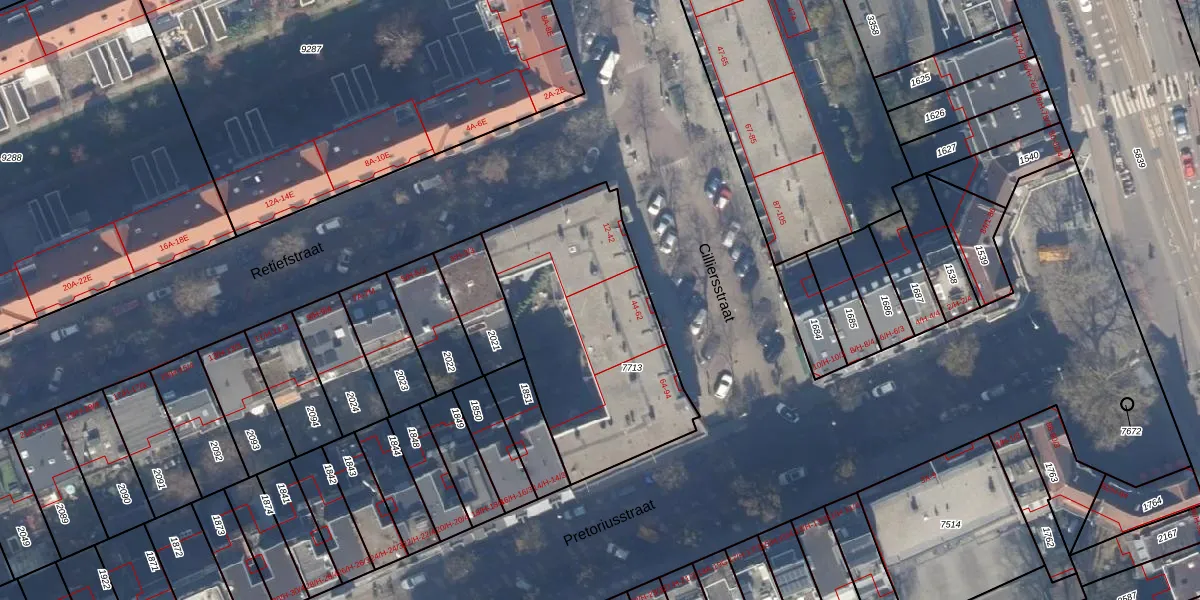 Het adres is gelegen op perceel 7713 in de sectie W en de kadastrale gemeente Amsterdam. De kadastrale aanduiding is aldus ASD19-W-7713. Het perceel is kleiner dan gemiddeld in Amsterdam. Het perceel is 1030 m² groot, terwijl het gemiddelde ligt op 1563,61 m². Het grootste perceel in de kadastrale gemeente is 17,9 ha. Het kleinste perceel heeft een oppervlakte van 0 m². Er zijn 42 adressen aanwezig op het perceel. In de Basisregistratie Kadaster (BRK) werden de grenzen van het perceel geregistreerd op 01-11-2006.