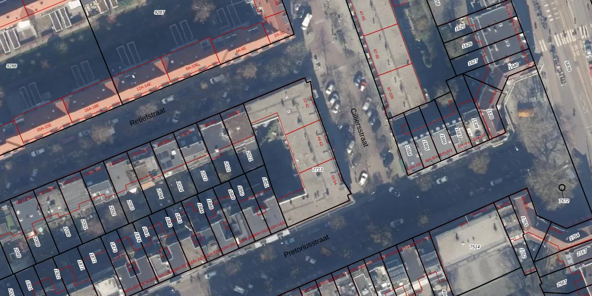 Het adres is gelegen op perceel 7713 in de sectie W en de kadastrale gemeente Amsterdam. De kadastrale aanduiding is aldus ASD19-W-7713. Het perceel is kleiner dan gemiddeld in Amsterdam. Het perceel is 1030 m² groot, terwijl het gemiddelde ligt op 1563,05 m². Het grootste perceel in de kadastrale gemeente is 17,9 ha. Het kleinste perceel heeft een oppervlakte van 0 m². Op het perceel liggen in totaal 42 adressen. In de Basisregistratie Kadaster (BRK) werden de grenzen van het perceel geregistreerd op 01-11-2006.