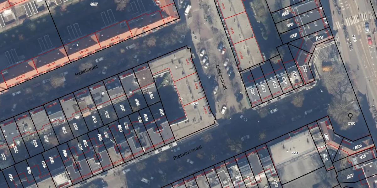 Het adres is gelegen op perceel 7713 in de sectie W en de kadastrale gemeente Amsterdam. De kadastrale aanduiding is aldus ASD19-W-7713. Het perceel is kleiner dan gemiddeld in Amsterdam. Het perceel is 1030 m² groot, terwijl het gemiddelde ligt op 1563,05 m². Het grootste perceel in de kadastrale gemeente is 17,9 ha. Het kleinste perceel heeft een oppervlakte van 0 m². Op het perceel liggen in totaal 42 adressen. De huidige grenzen van het perceel zijn digitaal in de Basisregistratie Kadaster (BRK) geregistreerd op 01-11-2006.