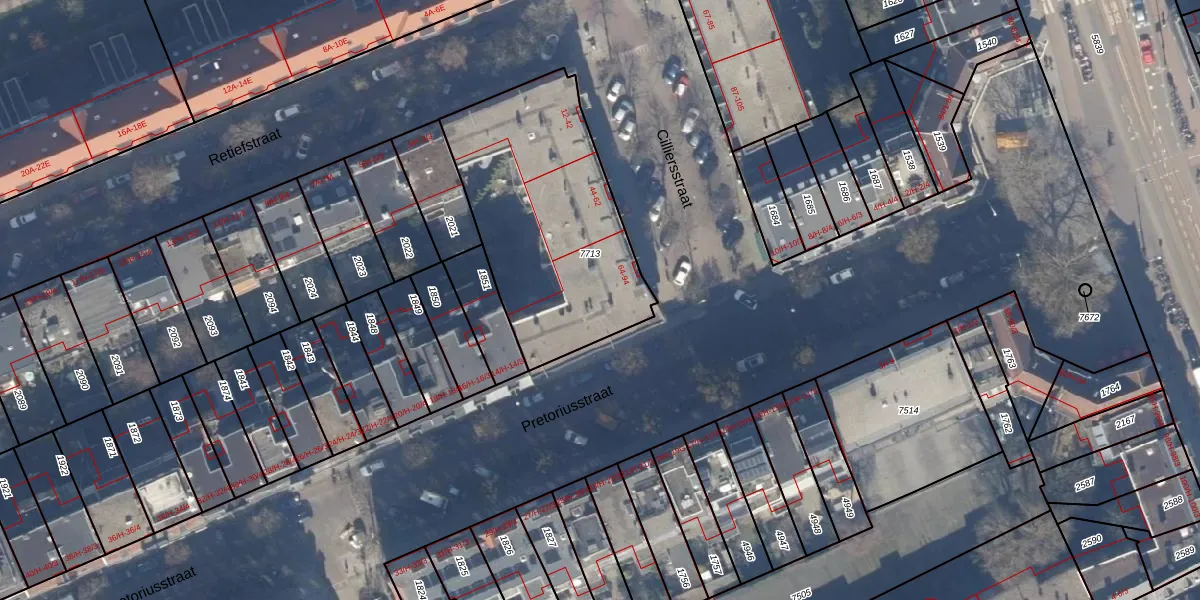 Het adres is gelegen op perceel 7713 in de sectie W en de kadastrale gemeente Amsterdam. De kadastrale aanduiding is aldus ASD19-W-7713. Het perceel is kleiner dan gemiddeld in Amsterdam. Het perceel is 1030 m² groot, terwijl het gemiddelde ligt op 1563,05 m². Het grootste perceel in de kadastrale gemeente is 17,9 ha. Het kleinste perceel heeft een oppervlakte van 0 m². Op het perceel zijn 42 adressen aanwezig. De huidige grenzen van het perceel zijn digitaal in de Basisregistratie Kadaster (BRK) geregistreerd op 01-11-2006.
