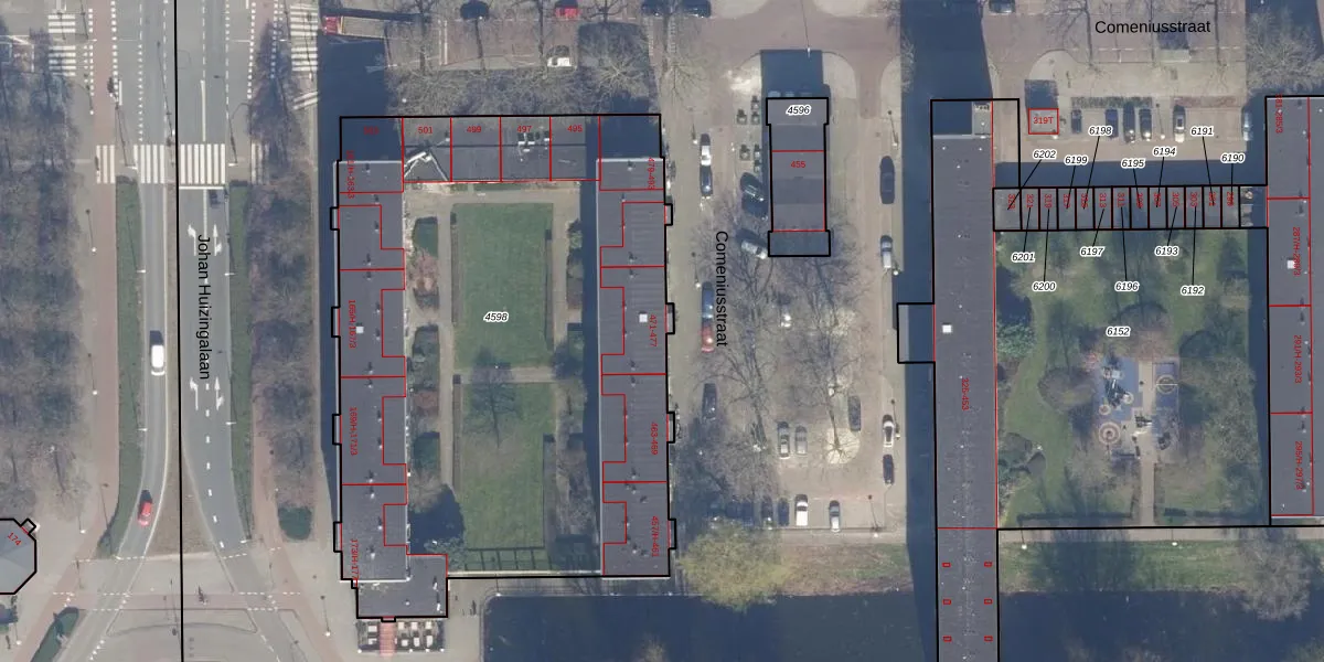 Het perceel waarop Comeniusstraat 473-H staat heeft een oppervlakte van 3557 m². Dit is een zeer groot perceel. De perceeloppervlakte wordt geregistreerd door het Kadaster. Gedetailleerde informatie over de maten van dit perceel kunt u vinden in het rapport Kadastrale kaart met maatvoering van Comeniusstraat 473-H.