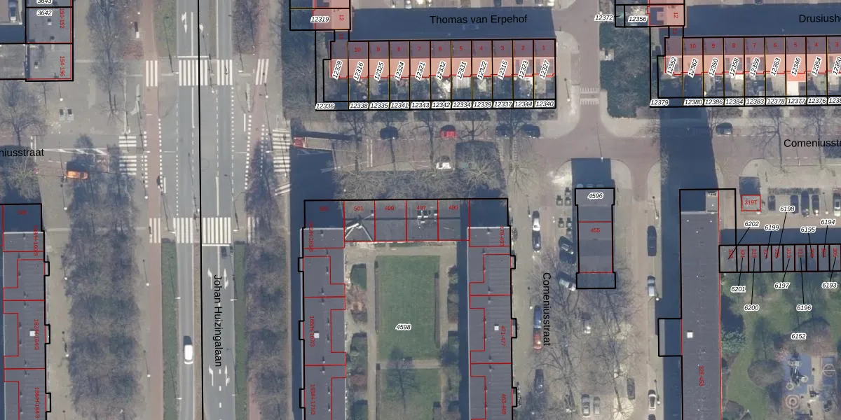 Het perceel waarop Comeniusstraat 497 staat heeft een oppervlakte van 3557 m². Dit is een zeer groot perceel. De perceeloppervlakte wordt geregistreerd door het Kadaster. Gedetailleerde informatie over de maten van dit perceel kunt u vinden in het rapport Kadastrale kaart met maatvoering van Comeniusstraat 497.