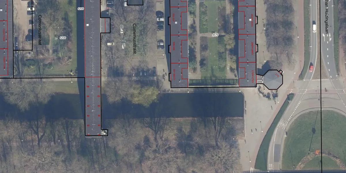 Het perceel waarop Comeniusstraat 551-3 staat heeft een oppervlakte van 3598 m². Dit is een zeer groot perceel. De perceeloppervlakte wordt geregistreerd door het Kadaster. Gedetailleerde informatie over de maten van dit perceel kunt u vinden in het rapport Kadastrale kaart met maatvoering van Comeniusstraat 551-3.