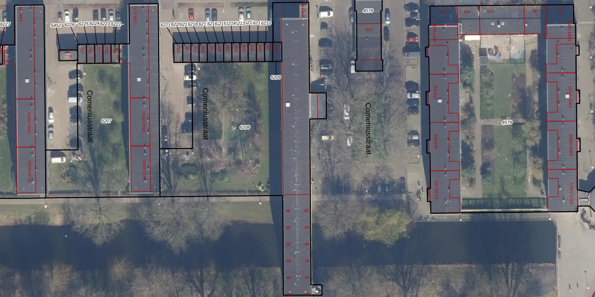 Het perceel waarop Comeniusstraat 583 staat heeft een oppervlakte van 2547 m². Dit is een zeer groot perceel. De perceeloppervlakte wordt geregistreerd door het Kadaster. Gedetailleerde informatie over de maten van dit perceel kunt u vinden in het rapport Kadastrale kaart met maatvoering van Comeniusstraat 583.