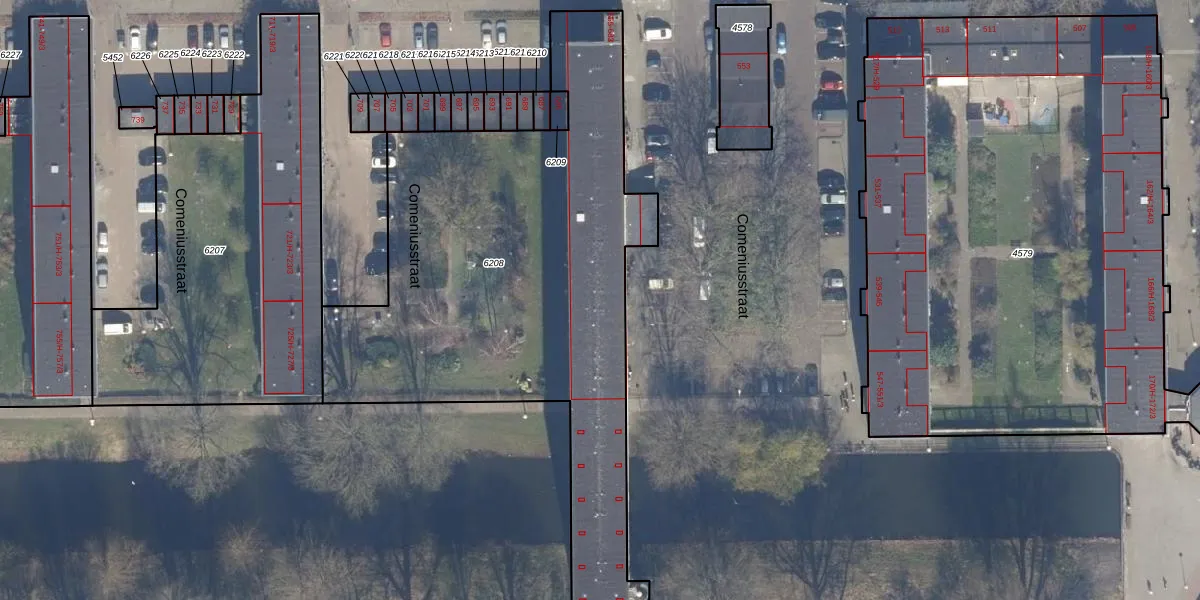Het perceel waarop Comeniusstraat 597 staat heeft een oppervlakte van 2547 m². Dit is een zeer groot perceel. De perceeloppervlakte wordt geregistreerd door het Kadaster. Gedetailleerde informatie over de maten van dit perceel kunt u vinden in het rapport Kadastrale kaart met maatvoering van Comeniusstraat 597.