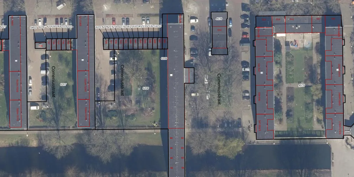 Het perceel waarop Comeniusstraat 655 staat heeft een oppervlakte van 2547 m². Dit is een zeer groot perceel. De perceeloppervlakte wordt geregistreerd door het Kadaster. Gedetailleerde informatie over de maten van dit perceel kunt u vinden in het rapport Kadastrale kaart met maatvoering van Comeniusstraat 655.
